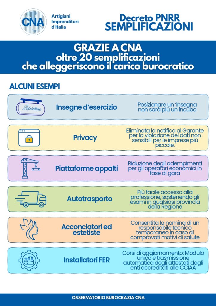 Con l’adozione del decreto PNRR all’esame oggi del Consiglio dei Ministri si completa un pacchetto di oltre 20 misure di semplificazione più volte sollecitate dalla CNA. Si tratta di misure che toccano direttamente oltre 800mila imprese e potenzialmente quelle interessate sono oltre un milione.