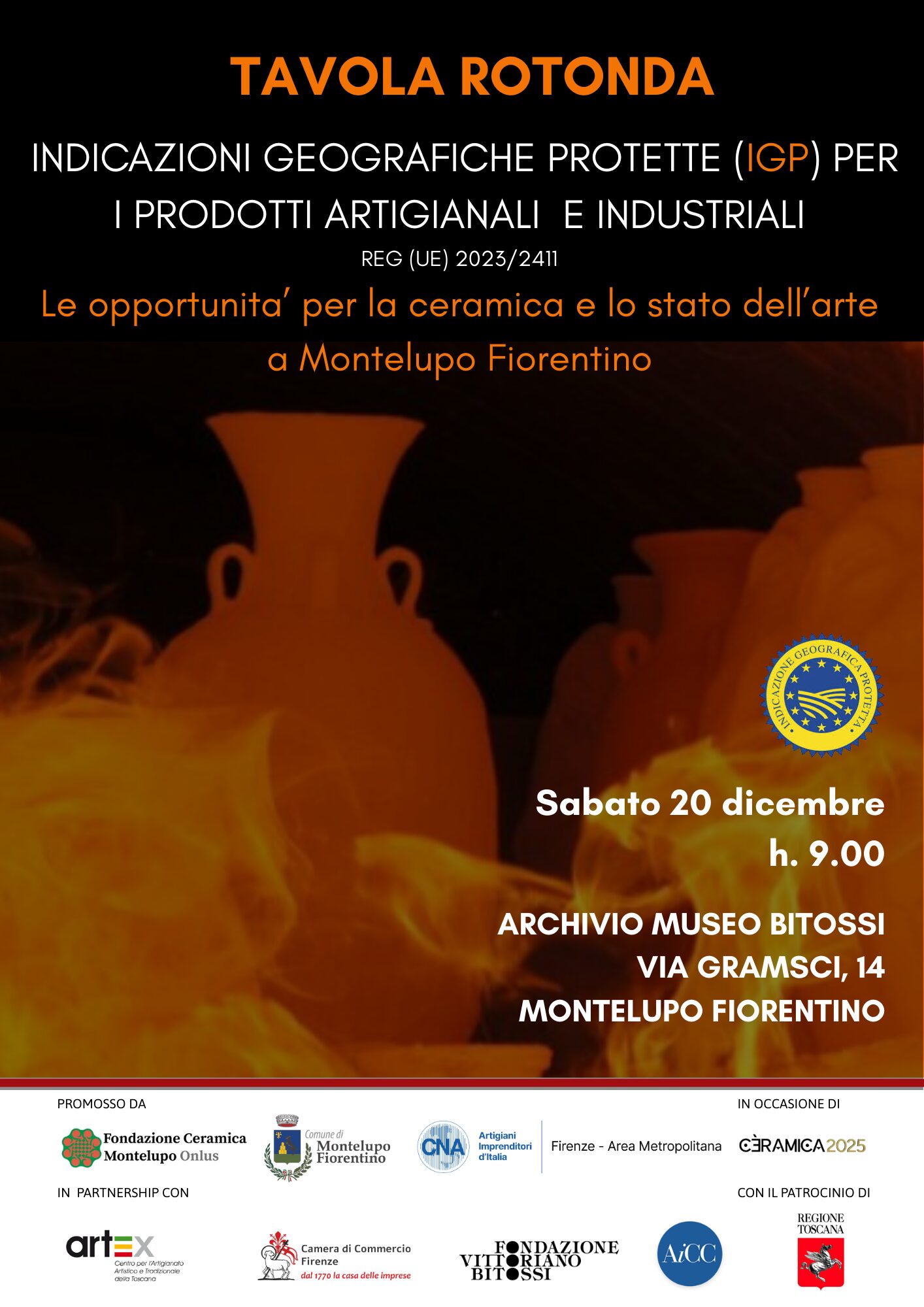 | In occasione di Céramica 2025, Fondazione Ceramica Montelupo, Comune di Montelupo Fiorentino e CNA Firenze Metropolitana, in collaborazione con Artex, Camera di Commercio di Firenze, Fondazione Vittorio Bitossi, AiCC e con il patrocinio di Regione Toscana, hanno organizzato la tavola rotonda Indicazioni Geografiche Protette (IGP) per i prodotti artigianali e industriali – Le opportunità per la ceramica e lo stato dell’arte a Montelupo Fiorentino che si svolgerà sabato 20 dicembre, dalle ore 9:00, presso l’Archivio Museo Bitossi a Montelupo Fiorentino (via Gramsci, 14). |